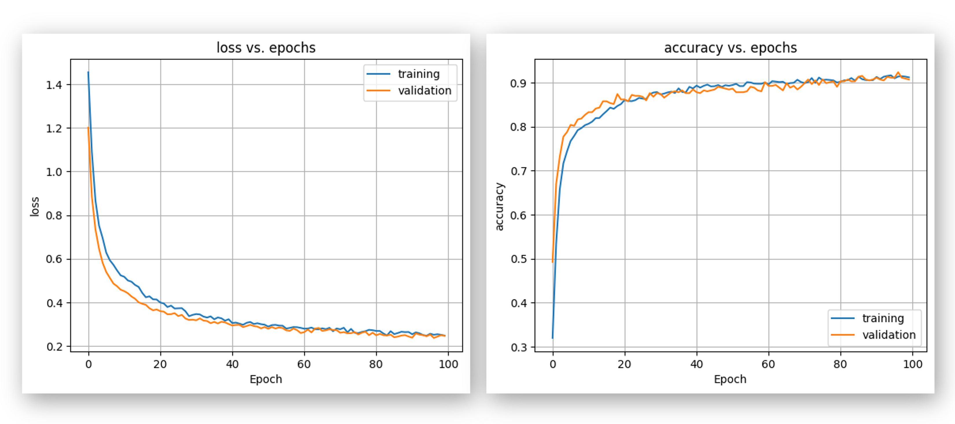 As hyper-parameters, we will have a Learning Rate of [0.005] and a model trained by [100] epochs. We will also include a data augmentation method based on SpecAugment. We trained the 1D and the 2D models with the same hyperparameters. The 1D architecture had a better overall result (90.5% accuracy when compared with 88% of the 2D, so we will use the 1D.