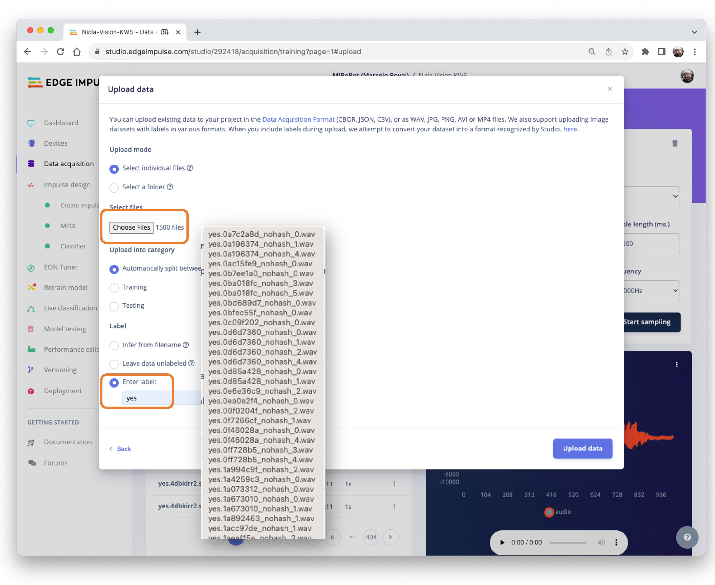 Initiate a new project at Edge Impulse Studio (EIS) and select the Upload Existing Data tool in the Data Acquisition section. Choose the files to be uploaded: