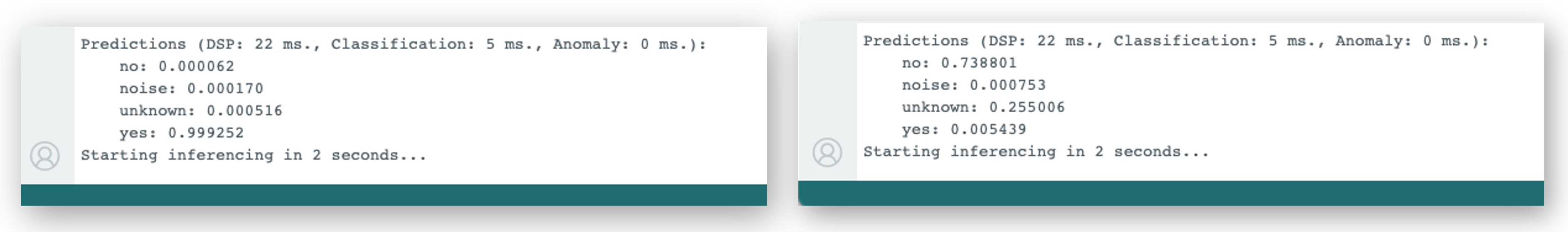 Upload the sketch to your board and test some real inferences. The idea is that the Green LED will be ON whenever the keyword YES is detected, the Red will lit for a NO, and any other word will turn on the Blue LED. All the LEDs should be off if silence or background noise is present. Remember that the same procedure can “trigger” an external device to perform a desired action instead of turning on an LED, as we saw in the introduction.
