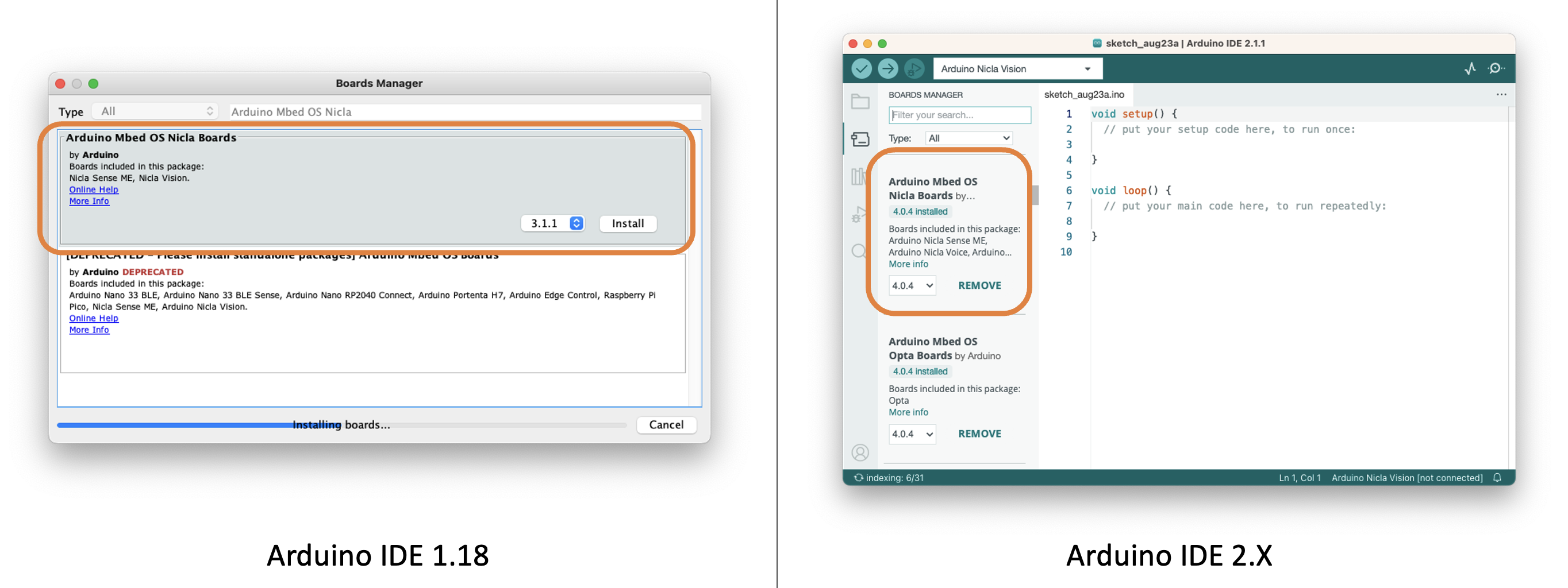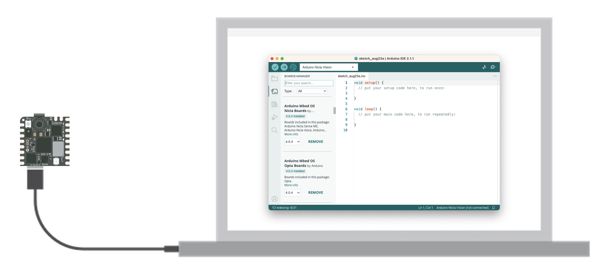 Install the Mbed OS core for Nicla boards in the Arduino IDE. Having the IDE open, navigate to Tools > Board > Board Manager, look for Arduino Nicla Vision on the search window, and install the board.
