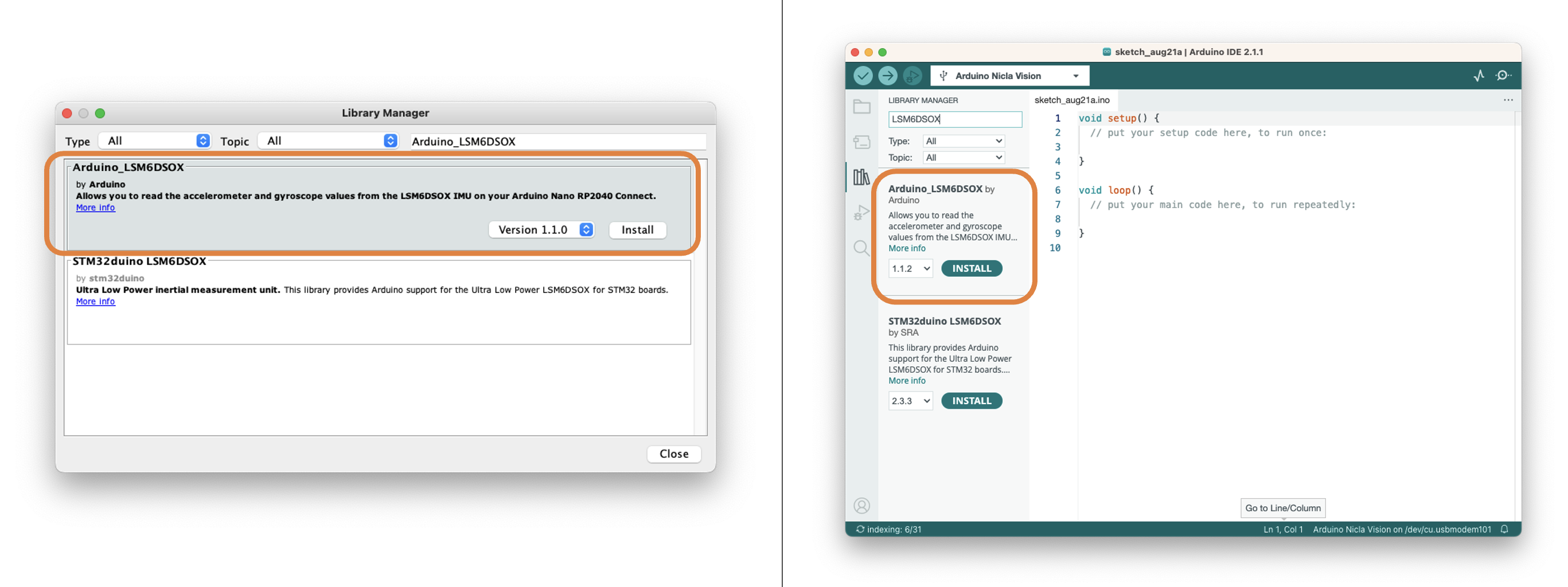 Before testing the IMU, it will be necessary to install the LSM6DSOX library. To do so, go to Library Manager and look for LSM6DSOX. Install the library provided by Arduino: