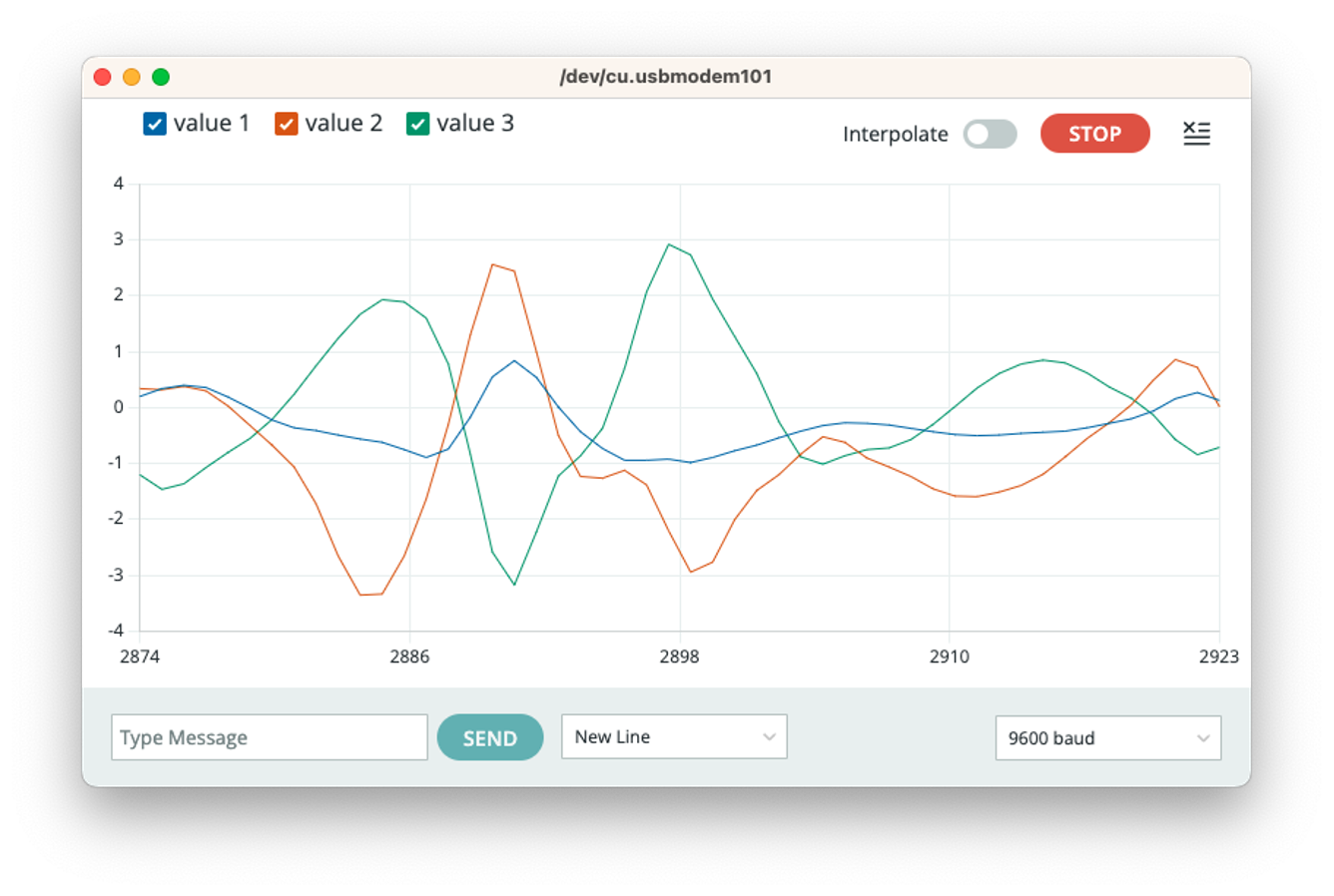 Next, go to Examples > Arduino_LSM6DSOX > SimpleAccelerometer and run the accelerometer test (you can also run Gyro and board temperature):