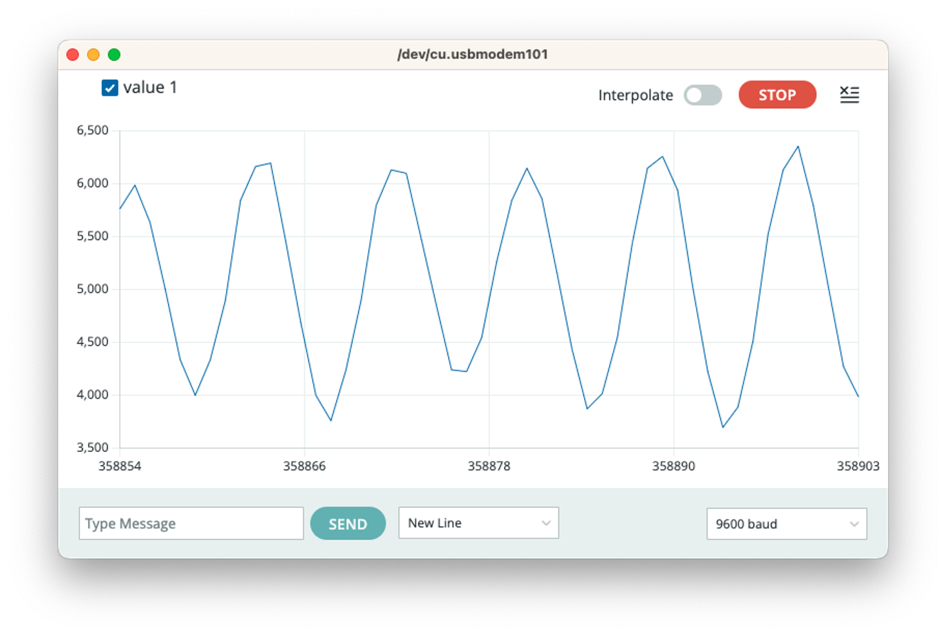 On Arduino IDE, go to Examples > PDM > PDMSerialPlotter, open it, and run the sketch. Open the Plotter and see the audio representation from the microphone: