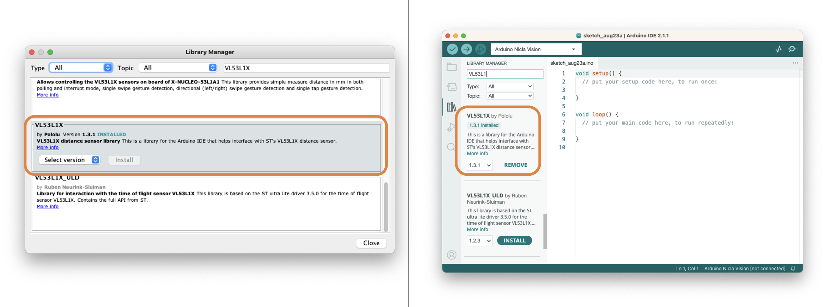 As we did with IMU, installing the VL53L1X ToF library is necessary. To do that, go to Library Manager and look for VL53L1X. Install the library provided by Pololu: