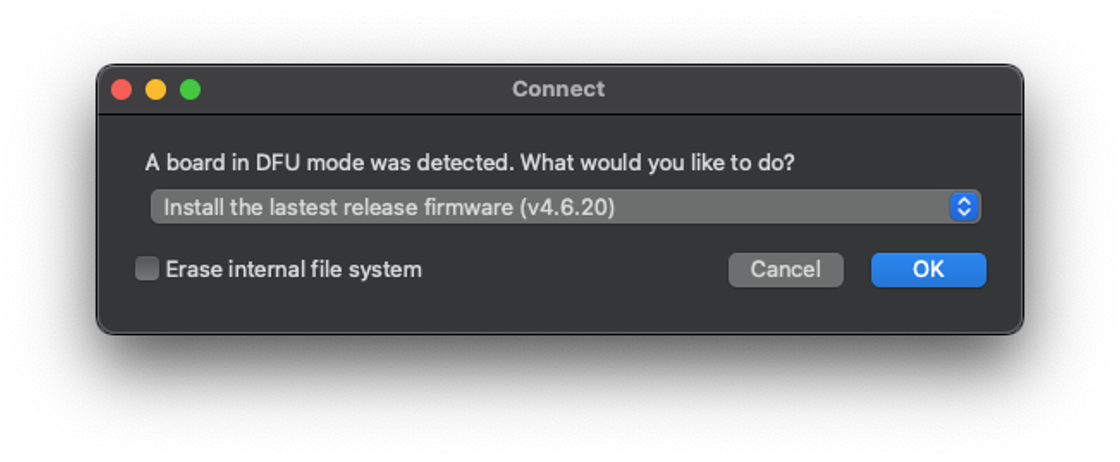 A pop-up will tell you that a board in DFU mode was detected and ask how you would like to proceed. First, select Install the latest release firmware (vX.Y.Z). This action will install the latest OpenMV firmware on the Nicla Vision.