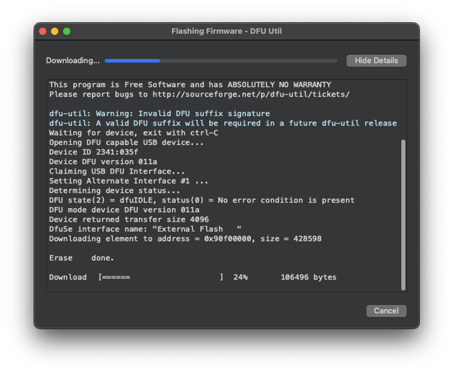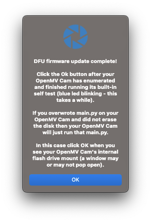 Wait until the green LED stops flashing and fading. When the process ends, you will see a message saying, “DFU firmware update complete!”. Press [OK].