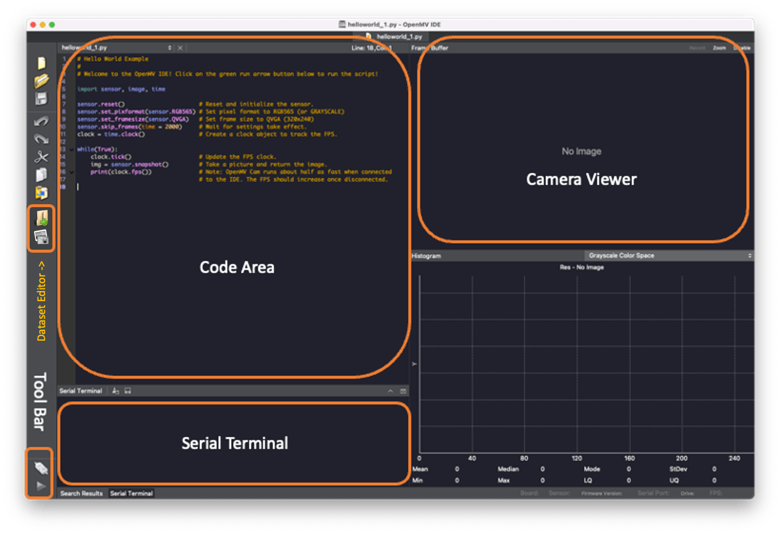 Any messages sent through a serial connection (using print() or error messages) will be displayed on the Serial Terminal during run time. The image captured by a camera will be displayed in the Camera Viewer Area (or Frame Buffer) and in the Histogram area, immediately below the Camera Viewer.