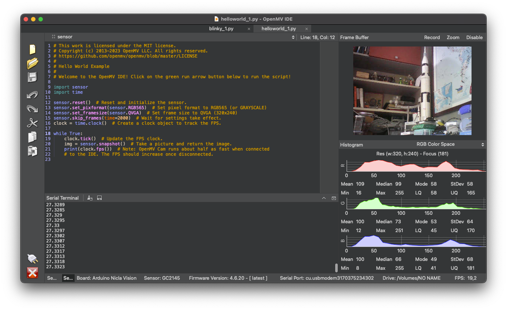When clicking the green play button, the MicroPython script (helloworld.py) on the Code Area will be uploaded and run on the Nicla Vision. On-Camera Viewer, you will start to see the video streaming. The Serial Monitor will show us the FPS (Frames per second), which should be around 27fps.