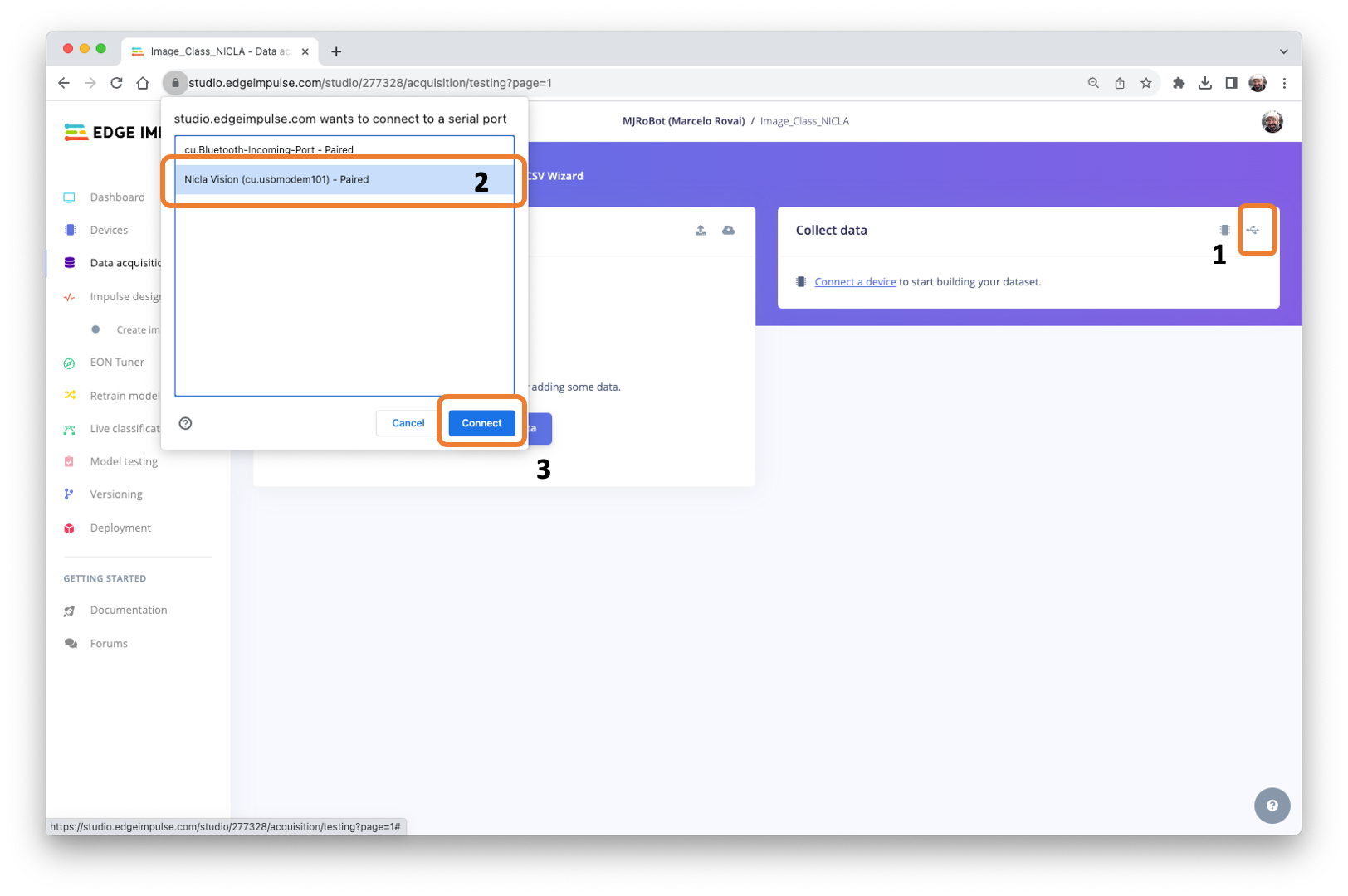 Go to your project on the Studio, and on the Data Acquisition tab, select WebUSB (1). A window will pop up; choose the option that shows that the Nicla is paired (2) and press [Connect] (3).
