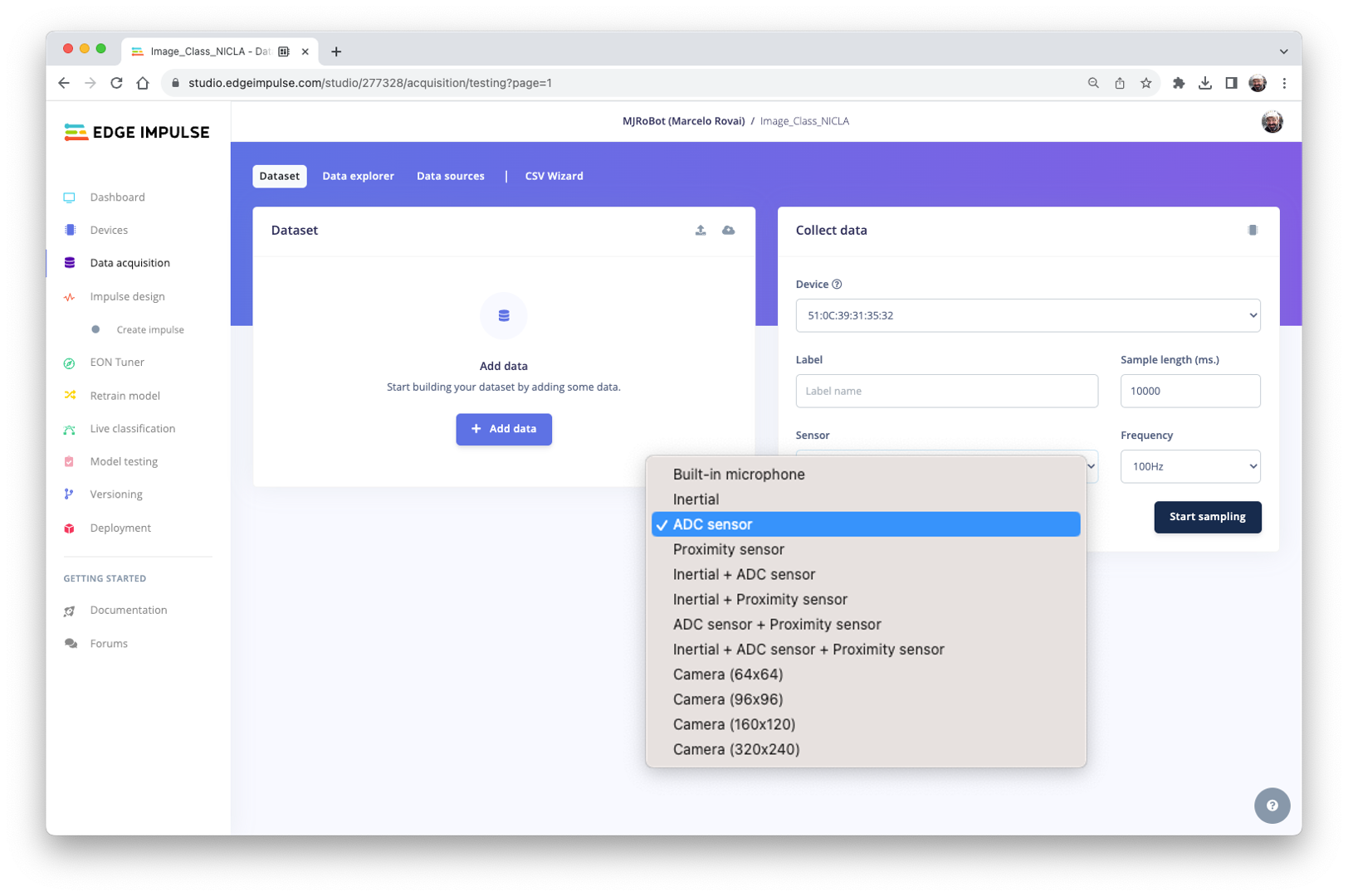 You can also test an external sensor connected to the ADC (Nicla pin 0) and the other onboard sensors, such as the built-in microphone, the ToF (Proximity) or a combination of sensors (fusion).