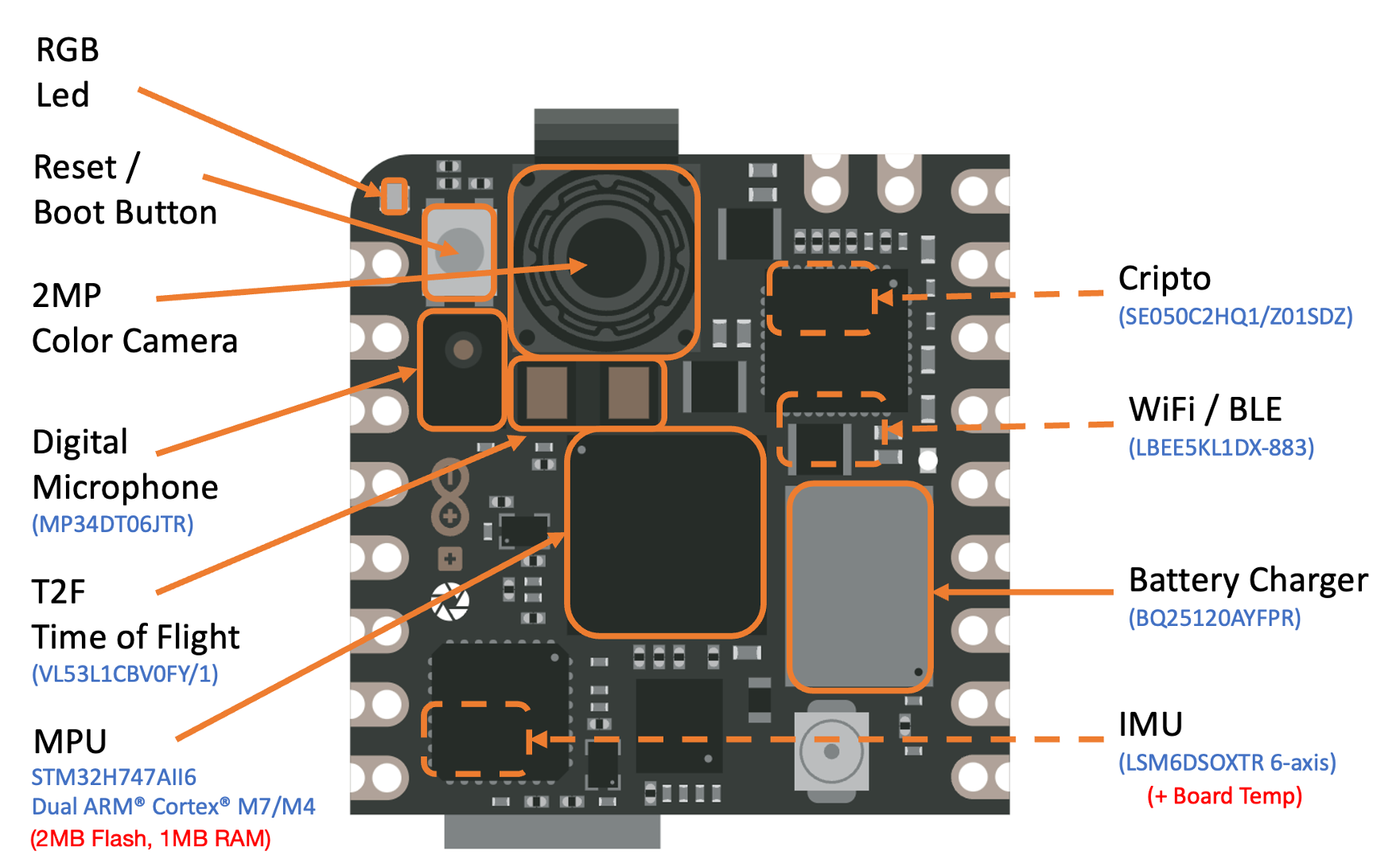 MP34DT05is an ultra-compact, low-power, omnidirectional, digital MEMS microphone built with a capacitive sensing element and the IC interface.6-Axis IMU: 3D gyroscope and 3D accelerometer data from the