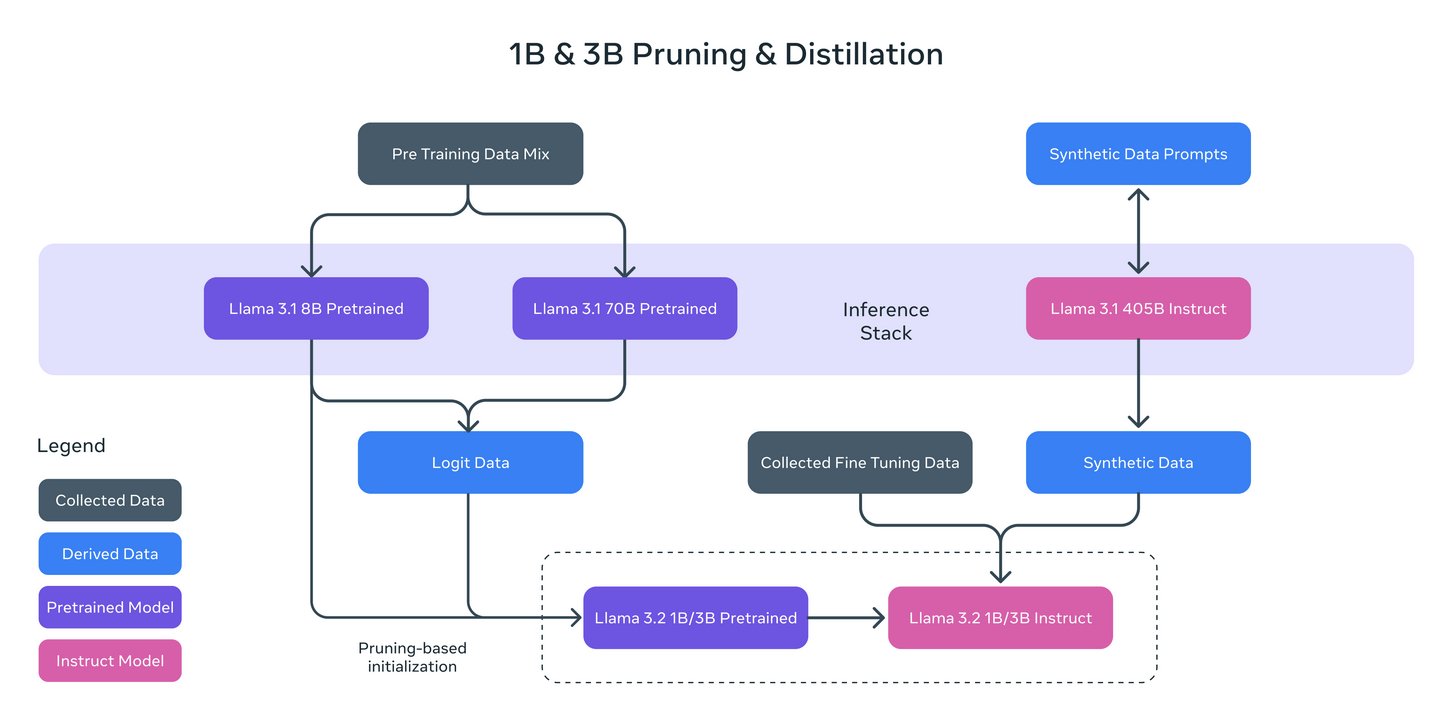 The 1B and 3B models were pruned from the Llama 8B, and then logits from the 8B and 70B models were used as token-level targets (token-level distillation). Knowledge distillation was used to recover performance (they were trained with 9 trillion tokens). The 1B model has 1,24B, quantized to integer (Q8_0), and the 3B, 3.12B parameters, with a Q4_0 quantization, which ends with a size of 1.3 GB and 2 GB, respectively. Its context window is 131,072 tokens.