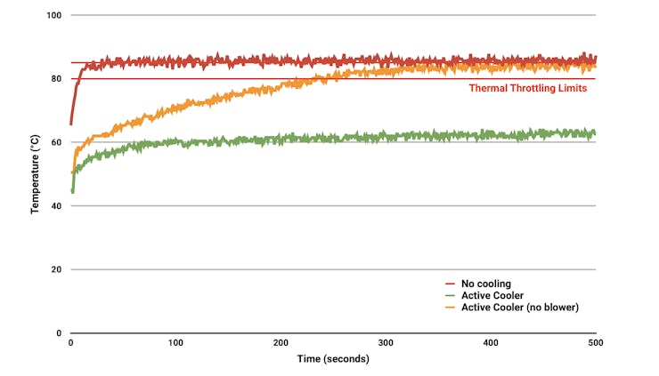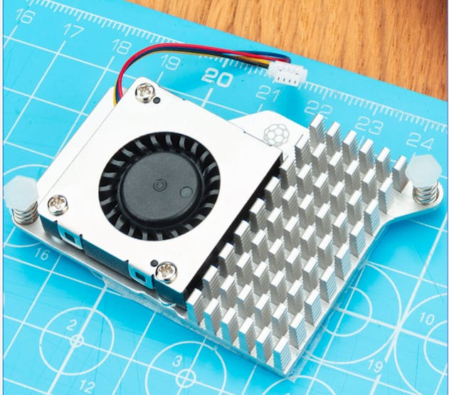 The Active Cooler has pre-applied thermal pads for heat transfer and is mounted directly to the Raspberry Pi 5 board using spring-loaded push pins. The Raspberry Pi firmware actively manages it: at 60°C, the blower’s fan will be turned on; at 67.5°C, the fan speed will be increased; and finally, at 75°C, the fan increases to full speed. The blower’s fan will spin down automatically when the temperature drops below these limits.