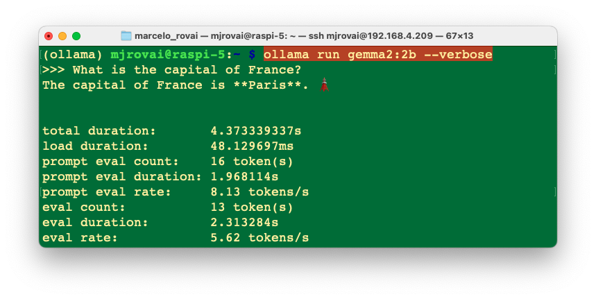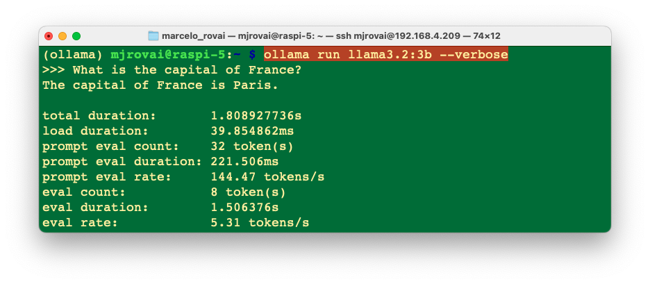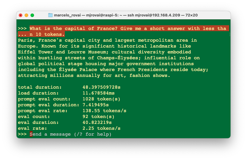 - Eval Count (8 token(s)): This is the number of tokens in the model’s response, which in this case was, “The capital of France is Paris.”