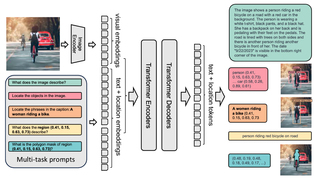 Multi-Modal Transformer Encoder-Decoder: Florence-2’s core is the multi-modal transformer encoder-decoder, which combines visual token embeddings from the image encoder with textual embeddings generated by a BERT-like model. This combination allows the model to simultaneously process visual and textual inputs, enabling a unified approach to tasks such as image captioning, object detection, and segmentation.