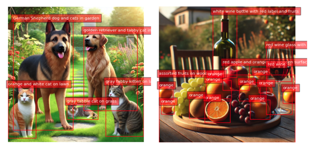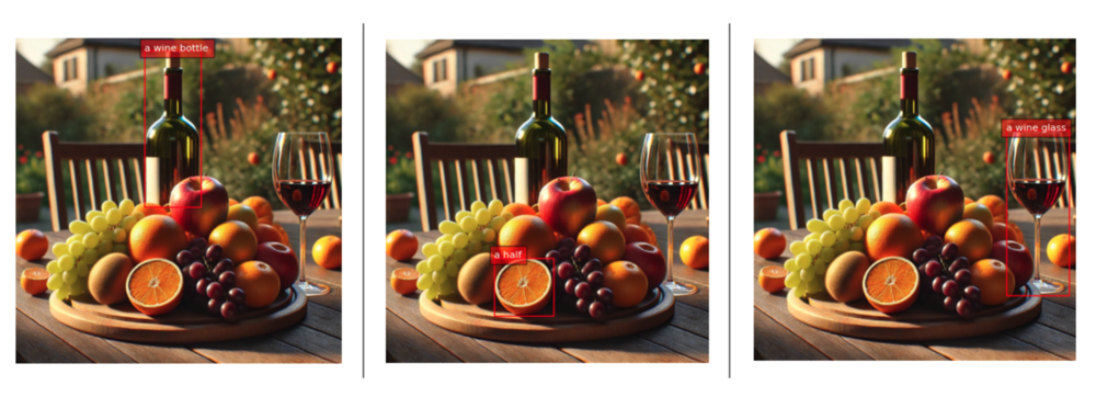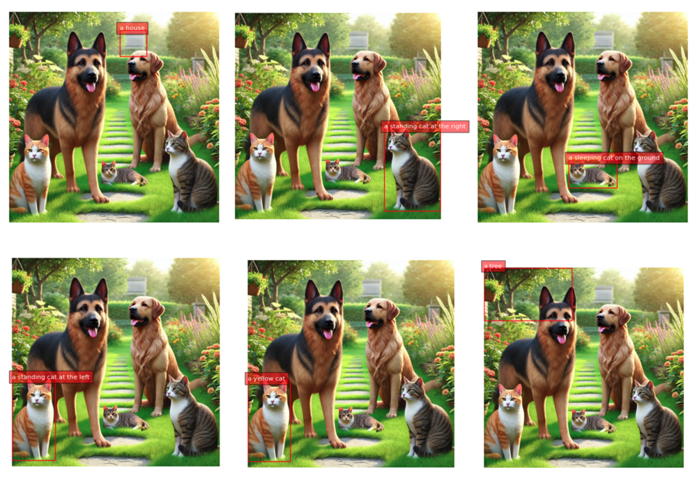 Visual grounding involves linking textual descriptions to specific regions within an image. This enables the model to understand where particular objects or entities described in a prompt are in the image. For example, if the prompt is “a red car,” the model will identify and highlight the region where the red car is found in the image. Visual grounding is helpful for applications where precise alignment between text and visual content is needed, such as human-computer interaction, image annotation, and interactive AI systems.