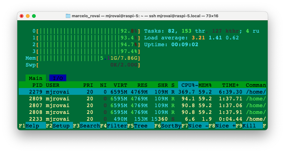 Running complex tasks can use all 8 GB of the Raspi-5’s memory. For example, the above screenshot during the Florence OD task shows 4 CPUs at full speed and over 5 GB of memory in use. Consider increasing the SWAP memory to 2 GB.
