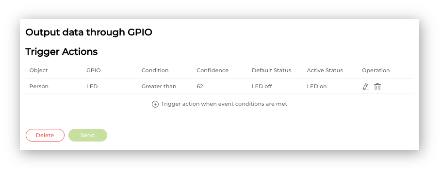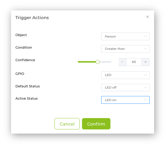 With the SebseCraft AI, we can do it on the Output -> GPIO section. Click on the Add icon to trigger the action when event conditions are met. A pop-up window will open, where you can define the action to be taken. For example, if a person is detected with a confidence of more than 60% the internal LED should be ON. In a real scenario, a GPIO, for example, D0, D1, D2, D11, or D12, would be used to trigger a relay to turn on a light.