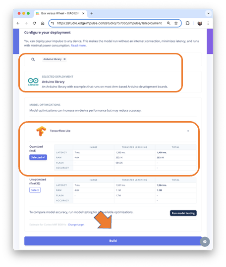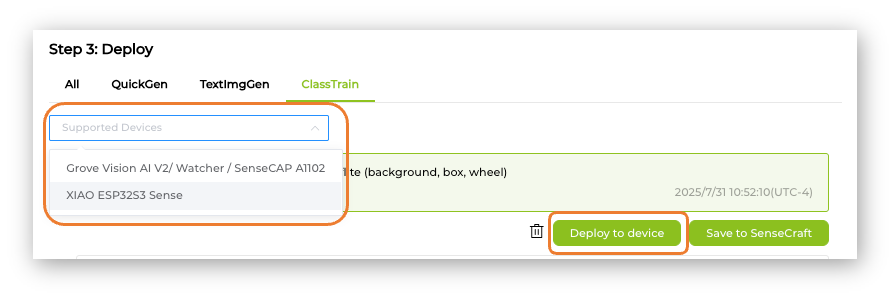 Select the trained model and XIAO ESP32S3 Sense at the Supported Devices window. And press [Deploy to device].