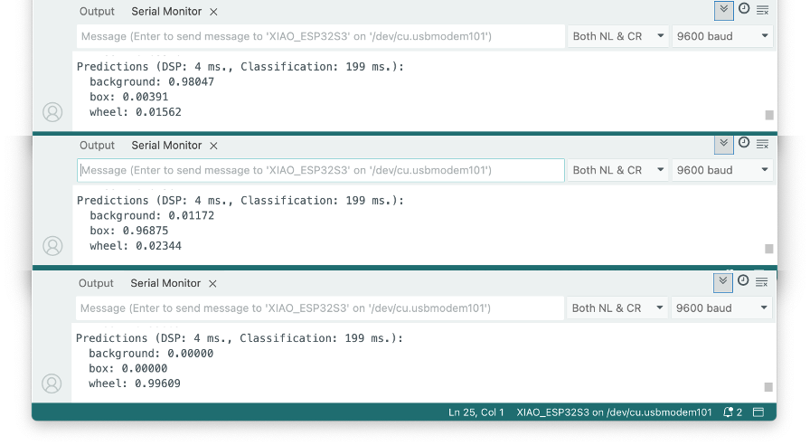 - Point the camera at the objects, and check the result on the Serial Monitor.