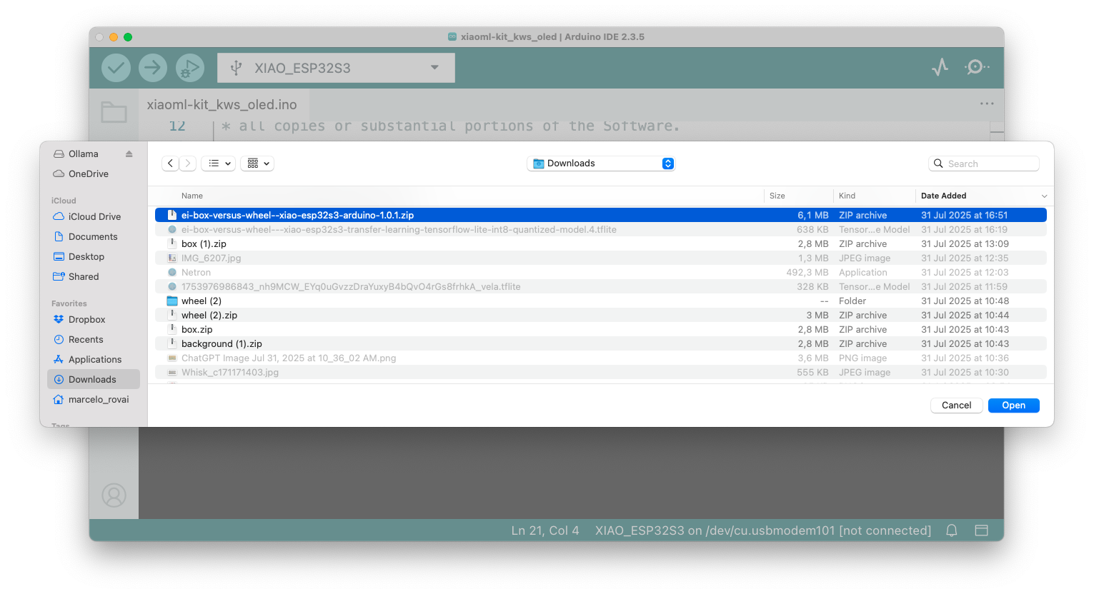 So, let’s modify the sketch to automatically adapt to the model trained on Edge Impulse by reading the class names and count directly from the model. The display will show abbreviated class names (3 letters) with larger fonts for better visibility on the tiny 72x40 pixel display. Download the code from the GitHub: XIAOML-Kit-Img_Class_OLED_Gen.