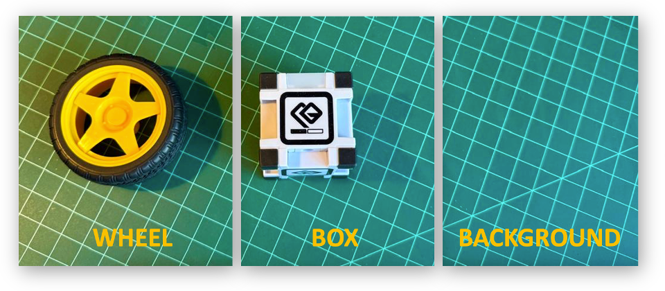 So, let’s simulate it, classifying, for example, a toy box and a toy wheel. We should also include a 3rd class of images, background, where there are no objects in the scene.
