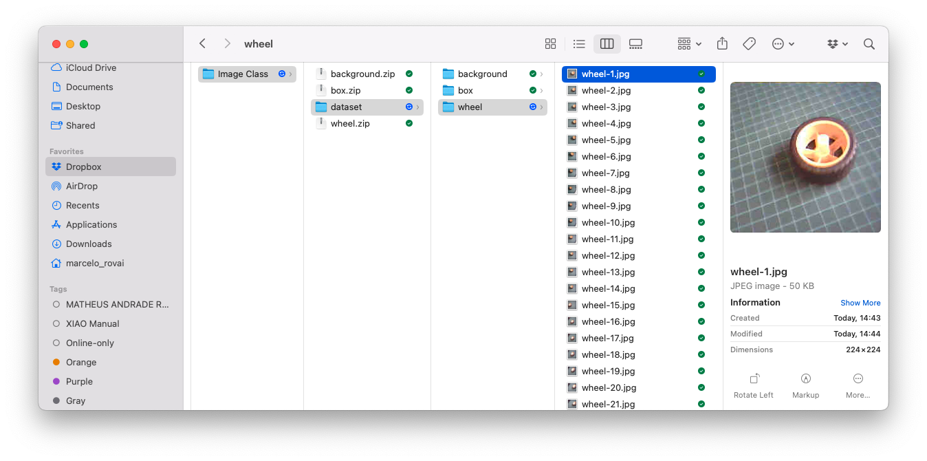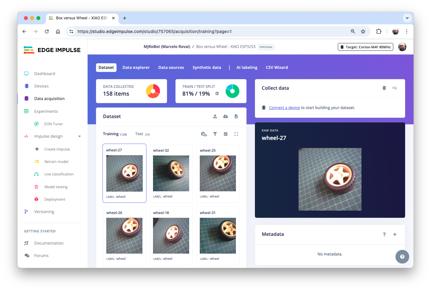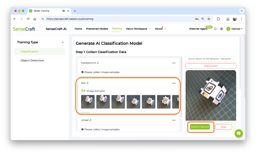 With TinyML, a set of techniques associated with machine learning inference on embedded devices, we should limit the classification to three or four categories due to limitations (mainly memory). We can, for example, train the images captured for the Box versus Wheel, which can be downloaded from the SenseCraft AI Studio.