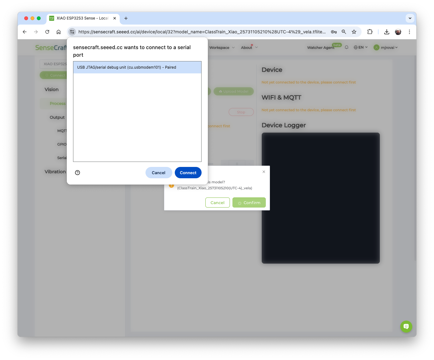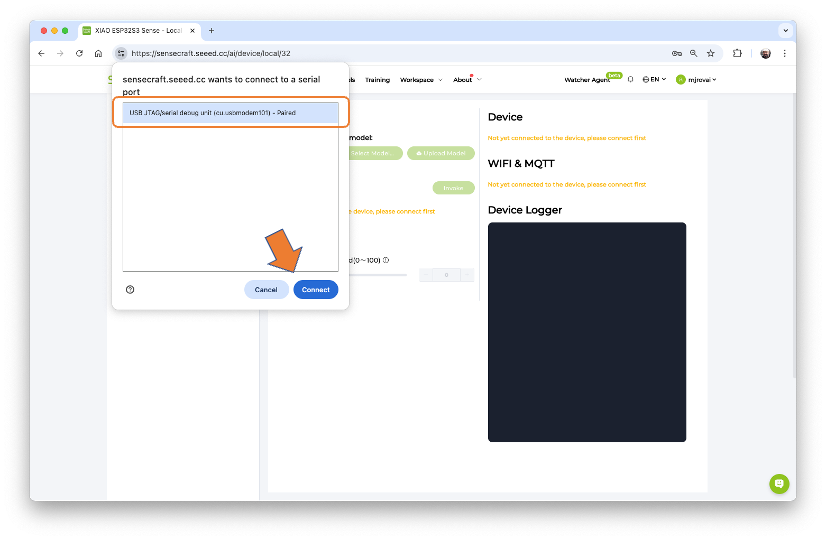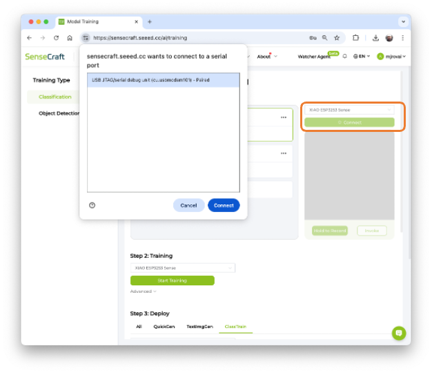 The default is to train a Classification model with a WebCam if it is available. Let’s select the XIAOESP32S3 Sense instead. Pressing the green button [Connect] will cause a Pop-Up window to appear. Select the corresponding Port and press the blue button [Connect].