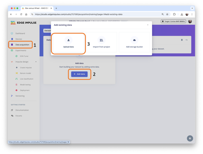 Next, go to the Data acquisition section and there, select + Add data. A pop-up window will appear. Select UPLOAD DATA.