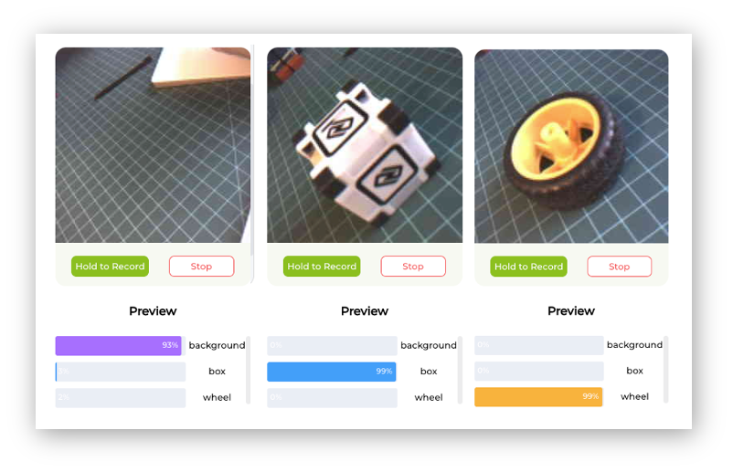 Select one of the classes and keep pressing the green button (Hold to Record) under the preview area. The collected images (and their counting) will appear on the Image Samples Screen. Carefully and slowly, move the camera to capture different angles of the object. To modify the position or interfere with the image, release the green button, rearrange the object, and then hold it again to resume the capture.