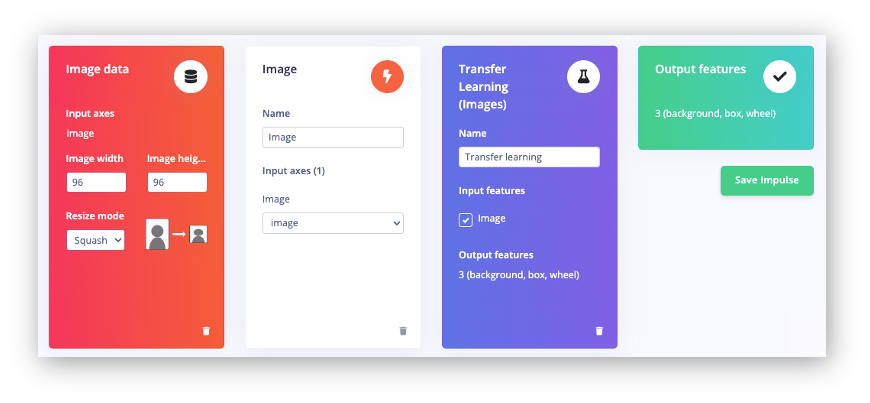 An impulse takes raw data (in this case, images), extracts features (resizes pictures), and then uses a learning block to classify new data.