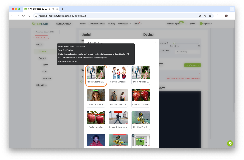 Once connected, select the option [Select Model...] and enter in the search window: “Person Classification”. From the options available, select the one trained over the MobileNet V2 (passing the mouse over the models will open a pop-up window with its main characteristics).