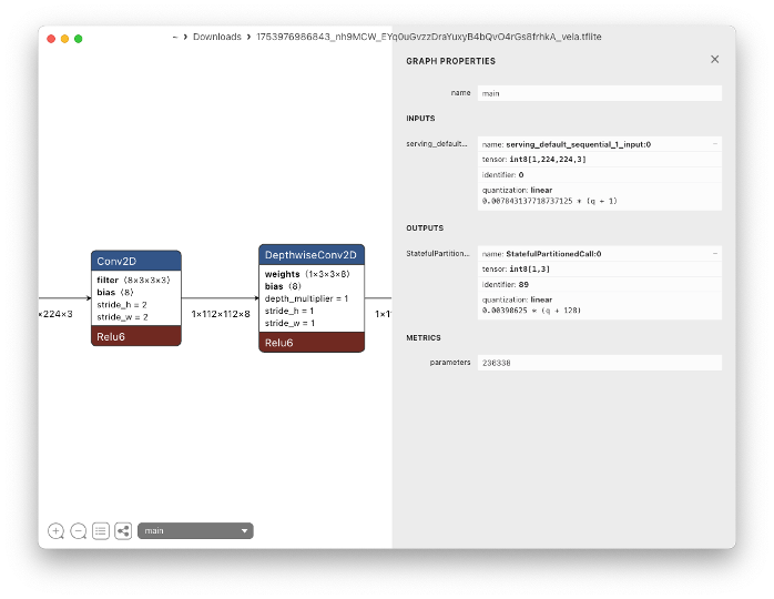 Note that the trained model (an Int8 MobileNet V2 with a size of 320KB) can be downloaded for further use or even analysis, for example, using Netron. Note that the model uses images of size 224x224x3 as its Input Tensor. In the next step, we will use different hyperparameters on the Edge Impulse Studio.
