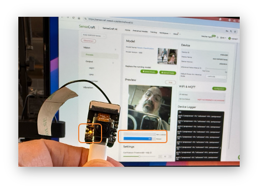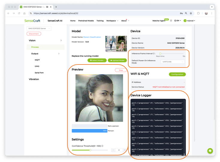 After the model is uploaded successfully, we can view the live feed from the XIAO camera and the classification result (Person or Not a Person) in the Preview area, along with the inference details displayed in the Device Logger.