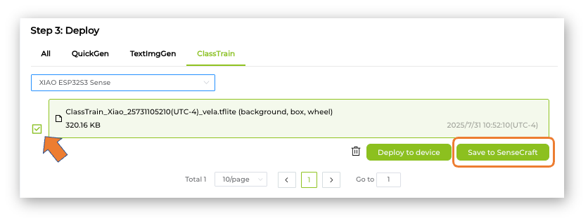 It is possible to save the model in the SenseCraft AI Studio. The Studio will retain all our models for later deployment. For that, return to the Training tab and select the button [Save to SenseCraft]: