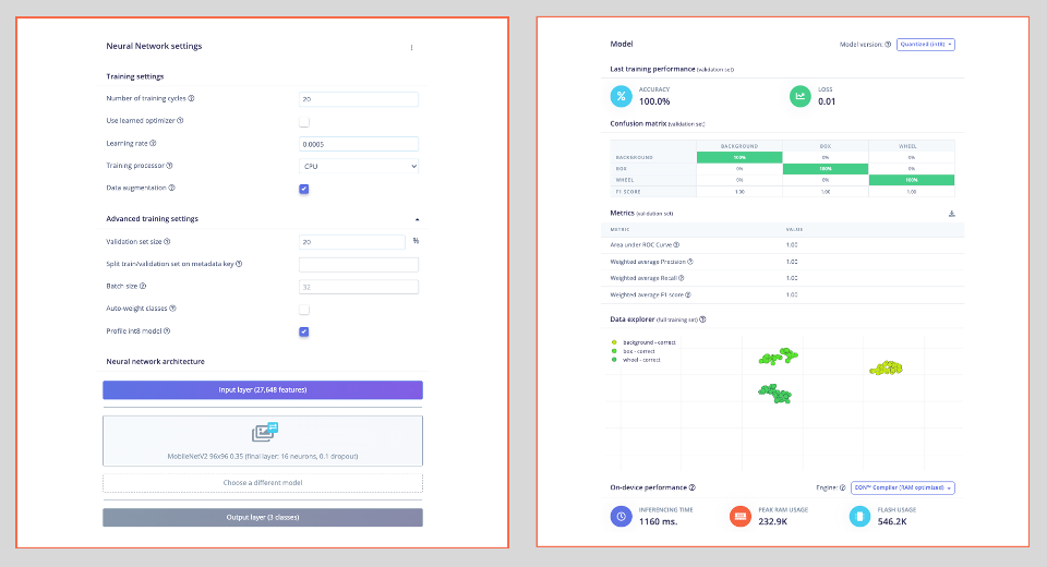 For more advanced applications, Edge Impulse Studio offers comprehensive machine learning pipeline tools, including custom dataset management, transfer learning with several pre-trained models, such as MobileNet, and model optimization.