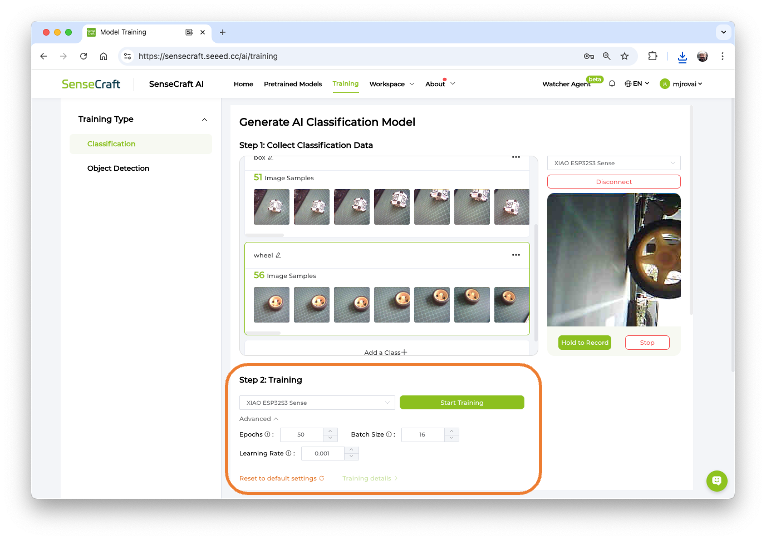 On SenseCraft AI Studio: Let’s open the tab Training: