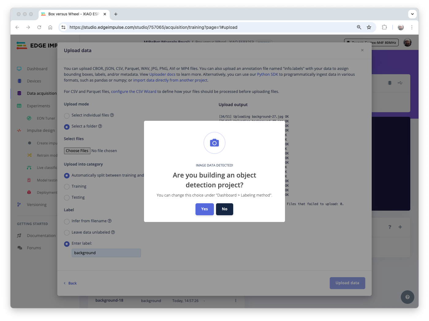 [Upload data] - At this point, the files will start to be uploaded, and after that, another Pop-Up window will appear asking if you are building an object detection project. Select