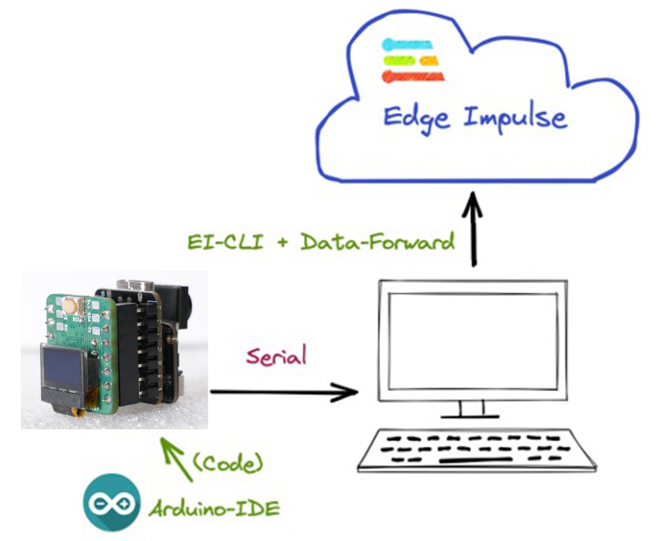 Once the XIAOML Kit is not a fully supported development board by Edge Impulse, we should, for example, use the CLI Data Forwarder to capture data from our sensor and send it to the Studio, as shown in this diagram: