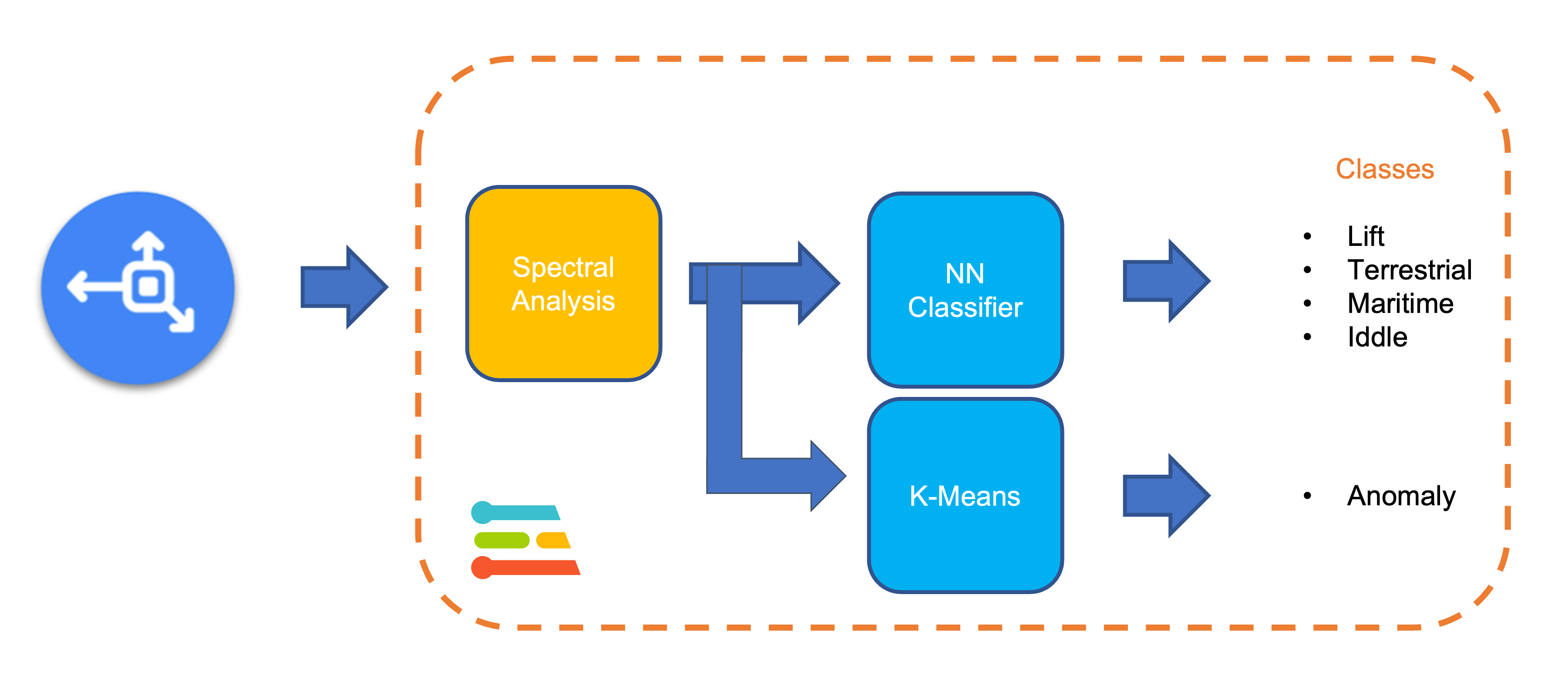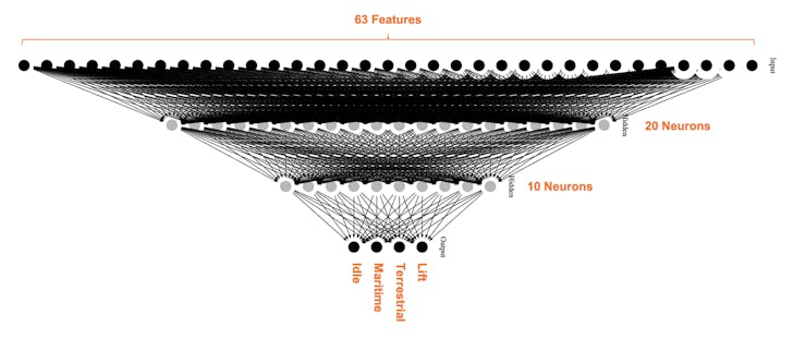 From the above image, we can define for our simulation that primarily horizontal movements (\(x\) or \(y\) axis) should be associated with the “Terrestrial class.” Vertical movements (\(z\)-axis) with the “Lift Class,” no activity with the “Idle class,” and movement on all three axes to Maritime class.