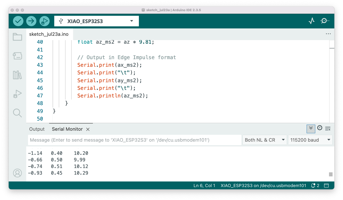 We’ll modify our test code to output data in a format suitable for Edge Impulse: