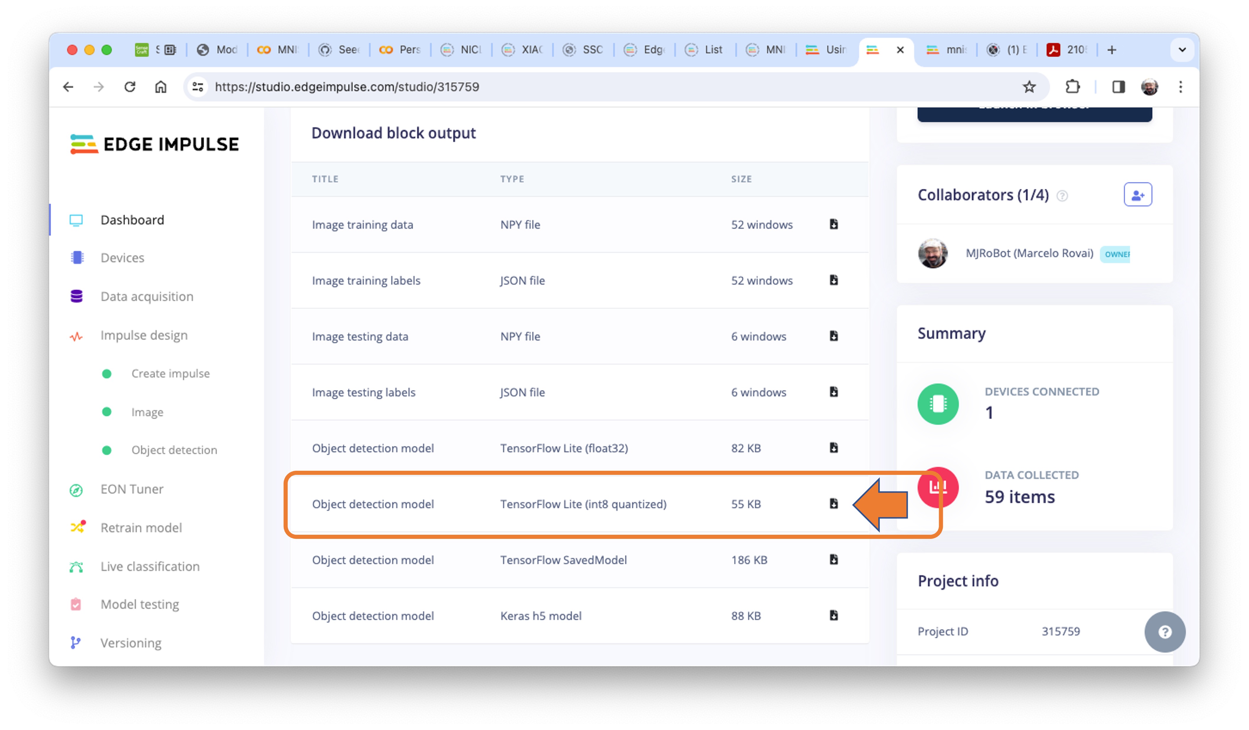 Dashboard, download the model (“block output”):Object Detection model - TensorFlow Lite (int8 quantized)