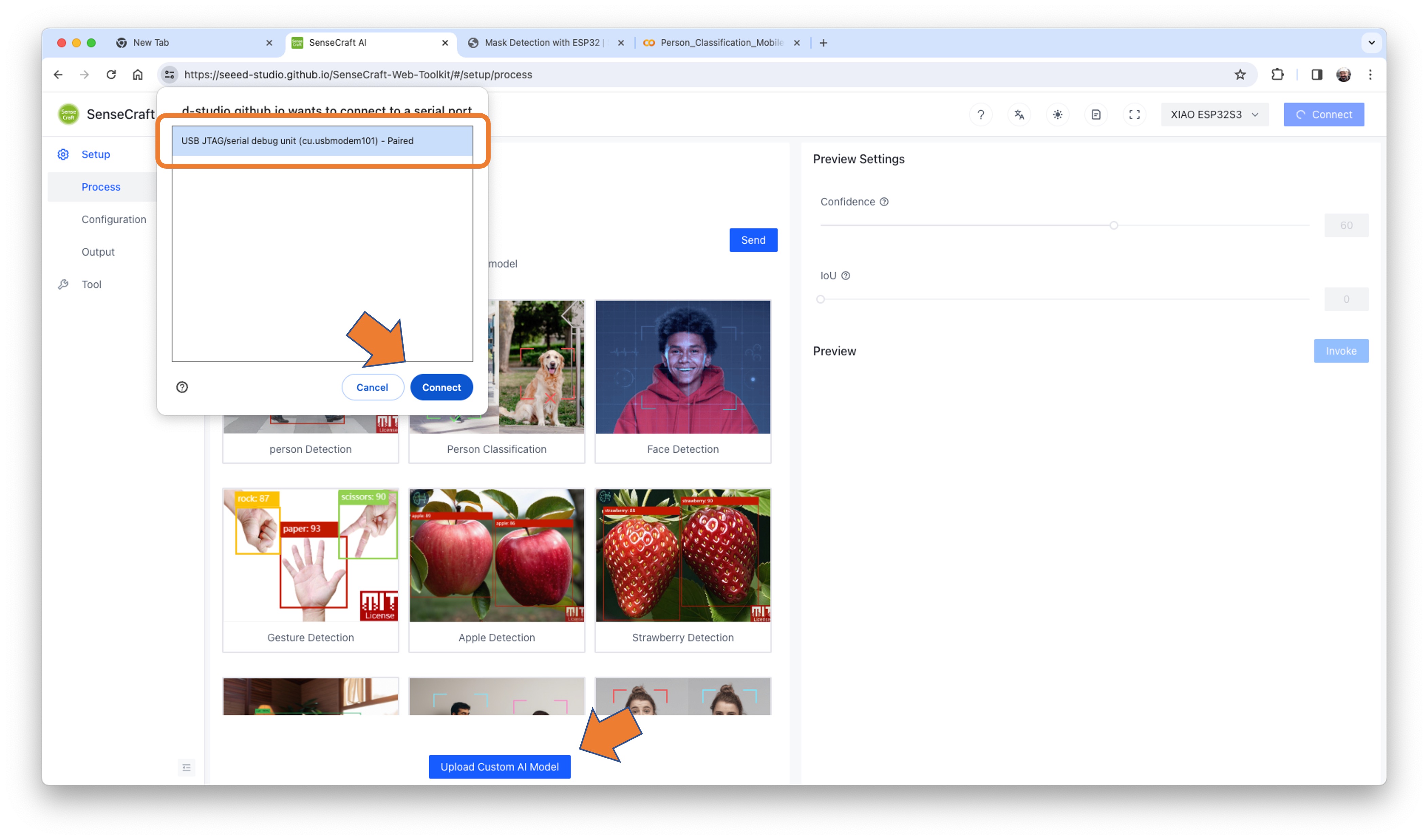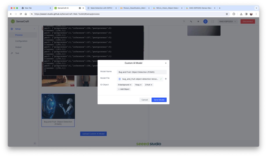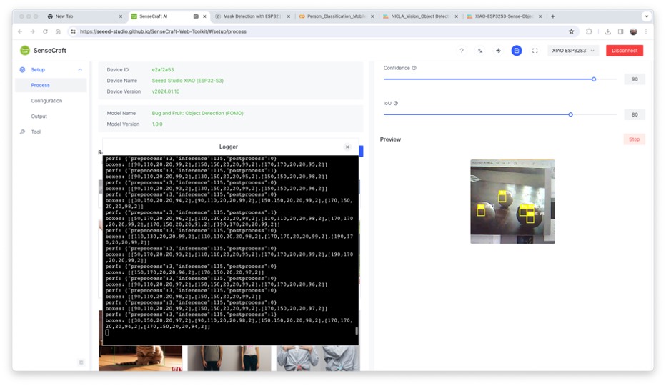 As discussed in the Image Classification chapter, verifying inference with Image models on Arduino IDE is very challenging because we can not see what the camera focuses on. Again, let’s use the SenseCraft-Web Toolkit.
