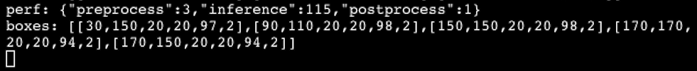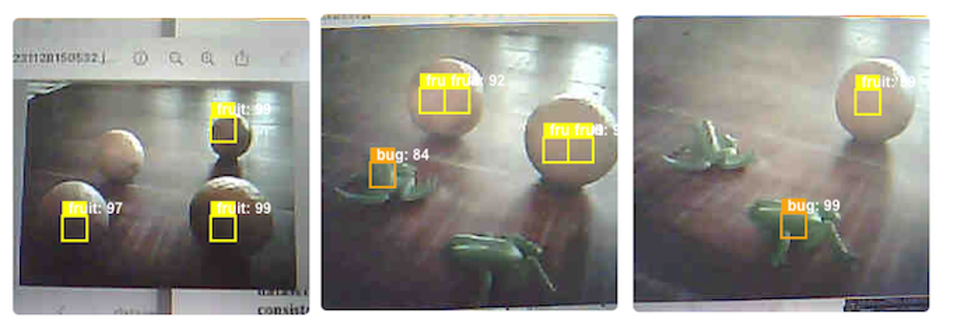 - Output tensor (boxes), for example, one of the boxes: [[30,150, 20, 20,97, 2]]; where 30,150, 20, 20 are the coordinates of the box (around the centroid); 97 is the inference result, and 2 is the class (in this case 2: fruit).