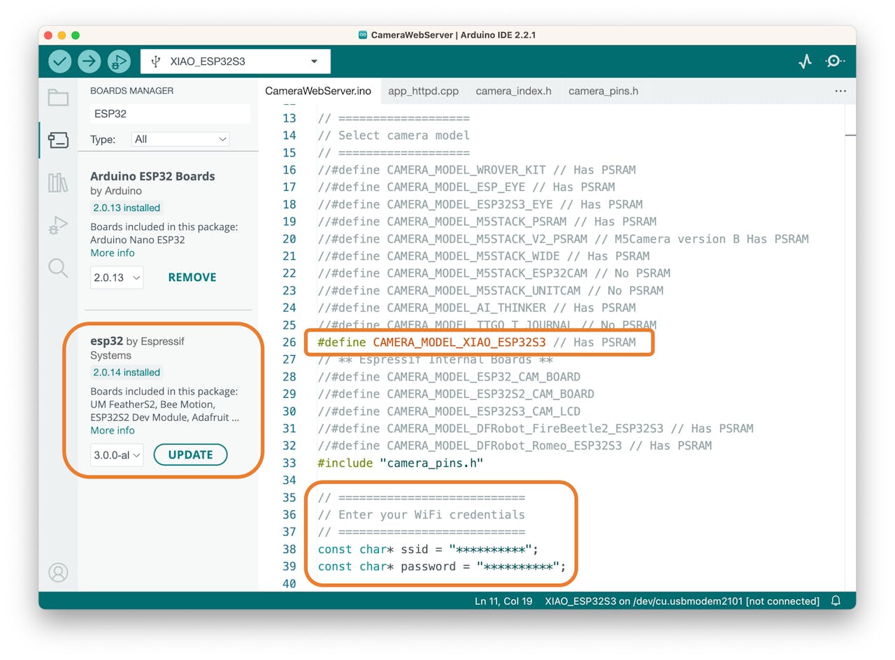 Open the Arduino IDE and select the XIAO_ESP32S3 board (and the port where it is connected). On File > Examples > ESP32 > Camera, select CameraWebServer.