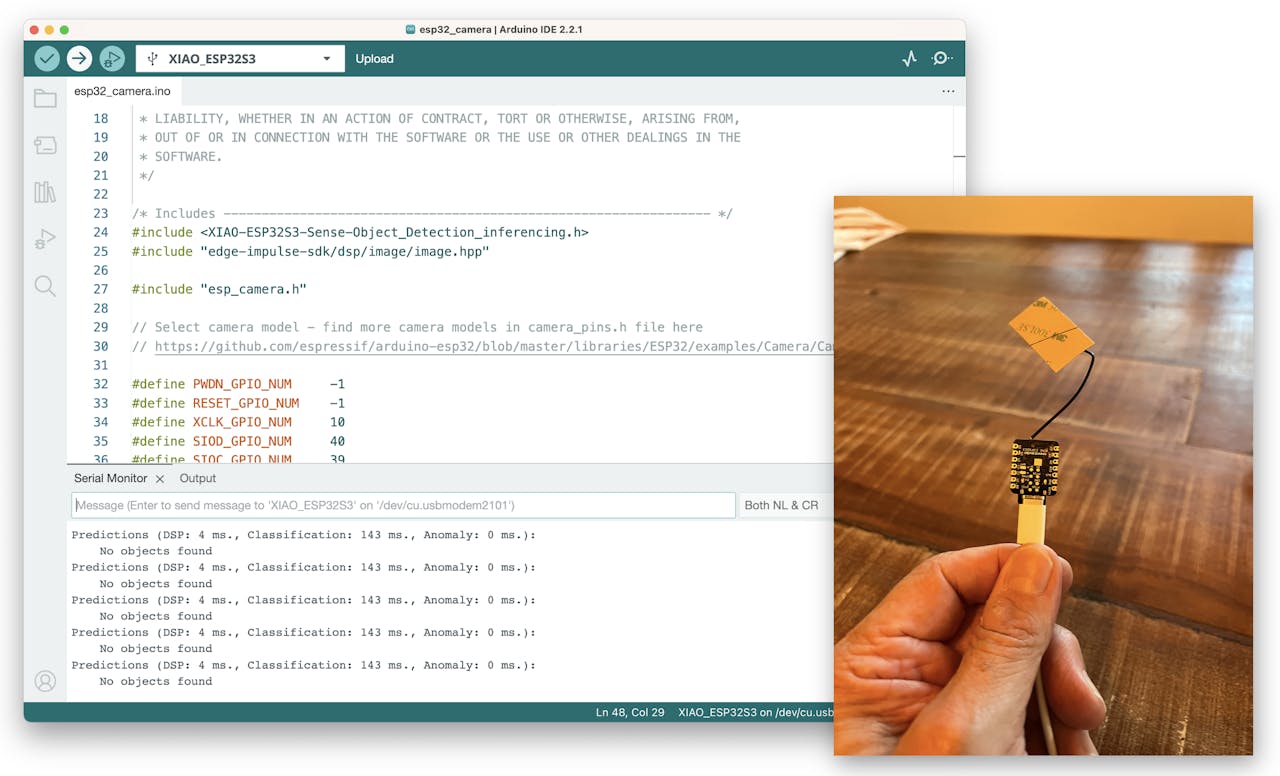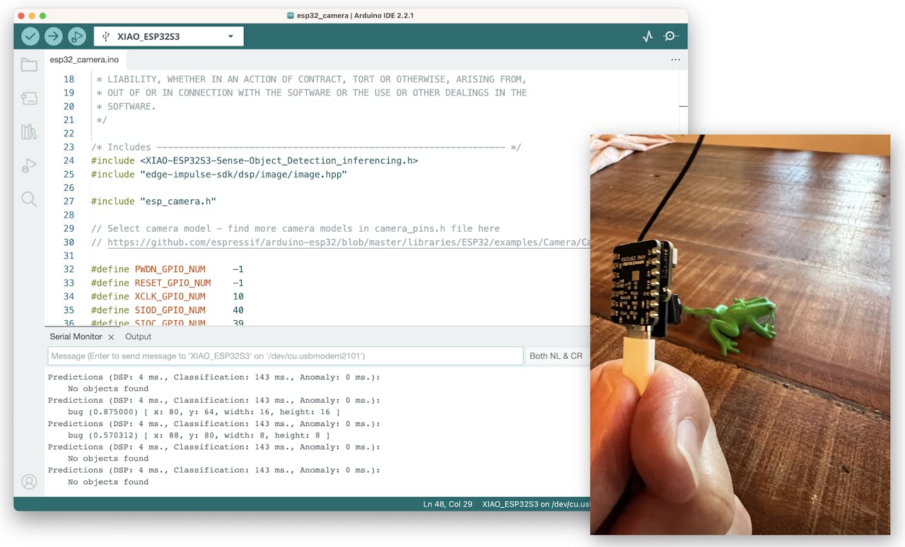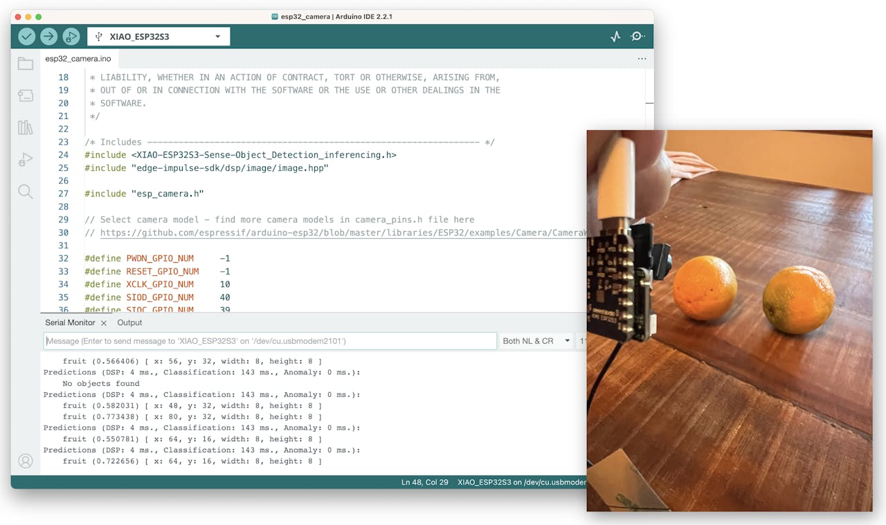 Upload the code to your XIAO ESP32S3 Sense, and you should be OK to start detecting fruits and bugs. You can check the result on Serial Monitor.