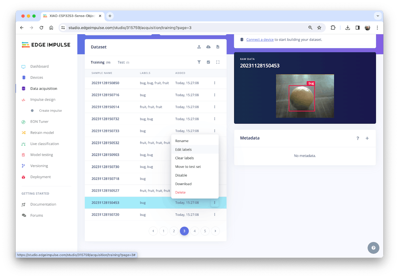 Next, review the labeled samples on the Data acquisition tab. If one of the labels is wrong, you can edit it using the three dots menu after the sample name: