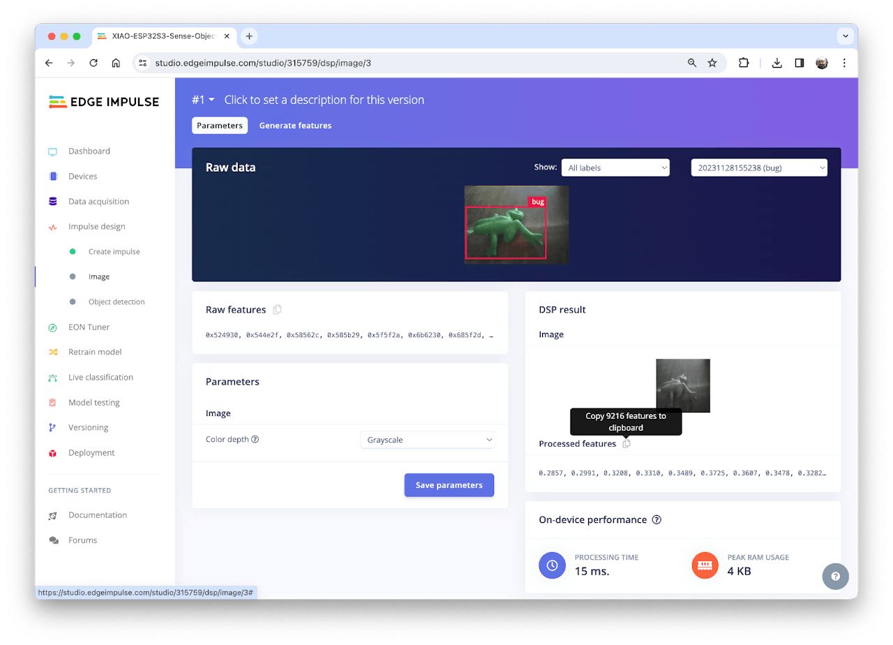 In this section, select Color depth as Grayscale, suitable for use with FOMO models and Save parameters.