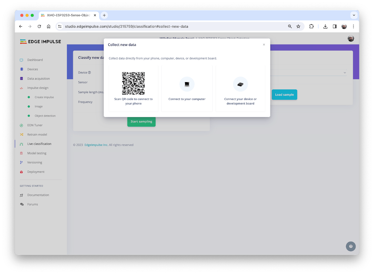 Once our model is trained, we can test it using the Live Classification tool. On the correspondent section, click on Connect a development board icon (a small MCU) and scan the QR code with your phone.