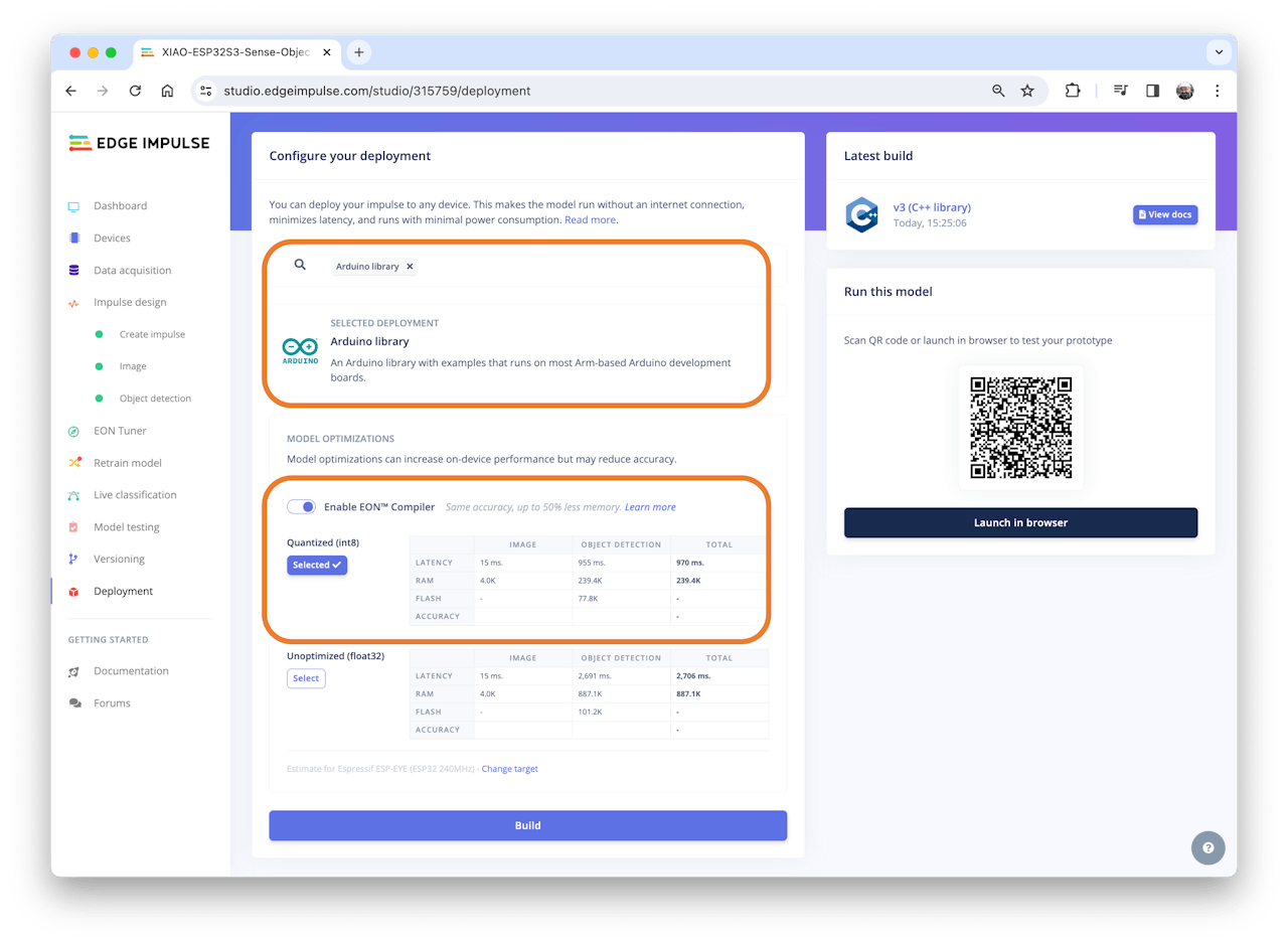 Select the Arduino Library and Quantized (int8) model, enable the EON Compiler on the Deploy Tab, and press [Build].